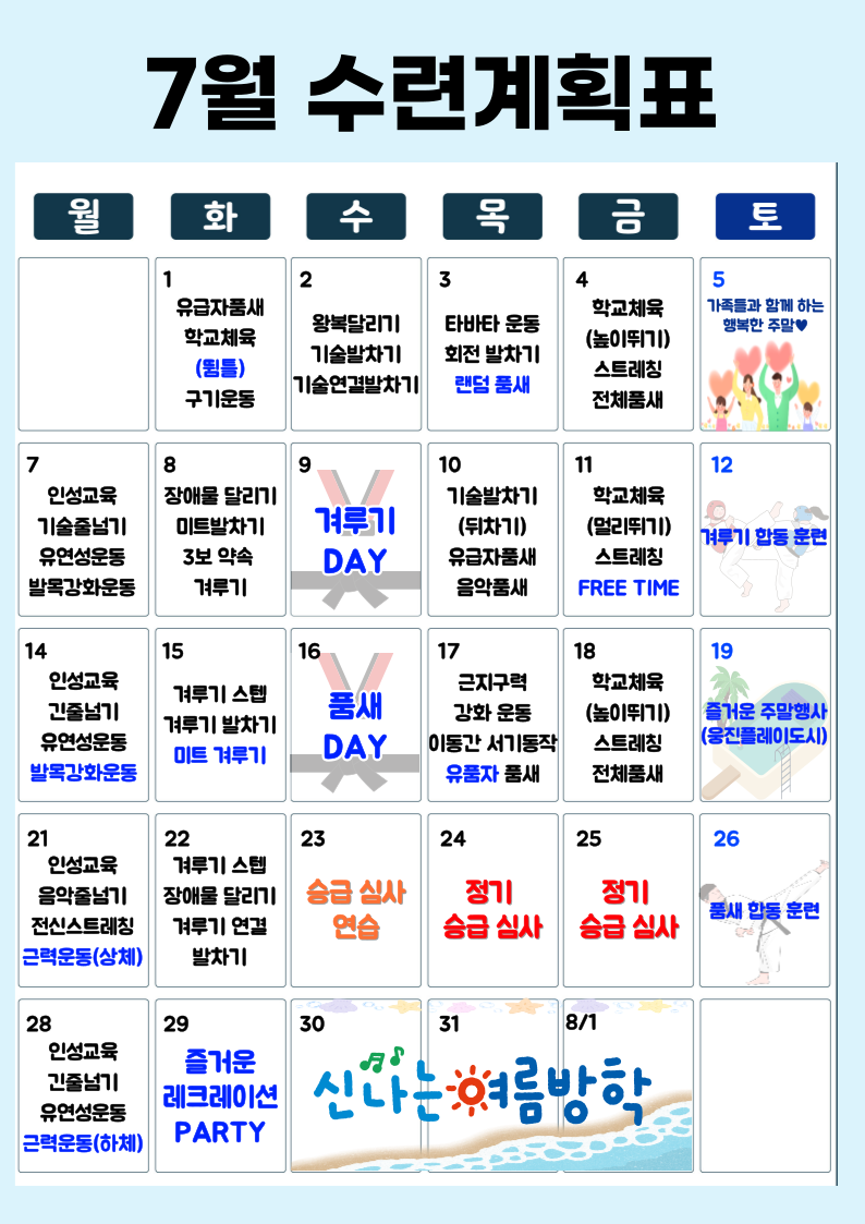강서 마곡점 25.7월달 수련계획표 페이지 정보 작성자 최고관리자 댓글 댓글 0건 조회Hit 43회 작성일Date 25-12-02 19:02 본문 추천0 비추천0 페이스북 공유 트위터 공유 관련링크 https://blog.naver.com/sjsc2022tkd/223820780584 17회 연결 https://www.band.us/band/97638386/post 21회 연결 목록 이전글25.8월달 수련계획표 25.12.02 다음글25.6월달 수련계획표 25.12.02 댓글 0 댓글목록 등록된 댓글이 없습니다.
